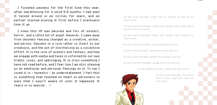 a mini-zine on my thoughts post-completing umineko for the first time - full of rambles and vulnerability! happy halloween :-)